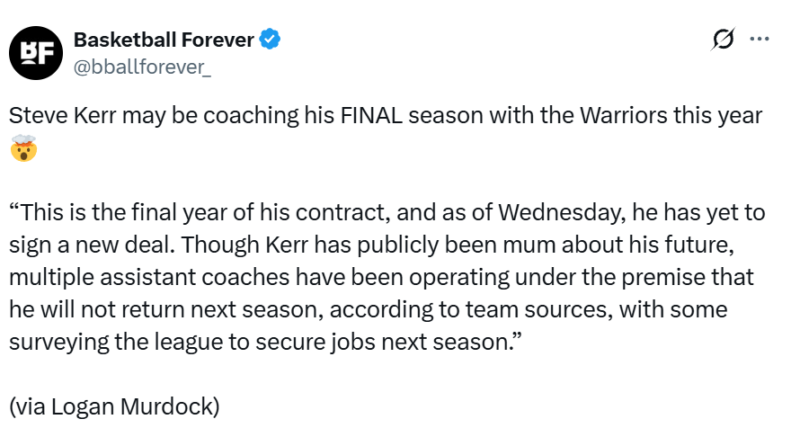 北京时间1月22日,据NBA记者Logan Murdock报道,科尔的未来,仍悬而未决,这可能是他执教勇士的最后一个赛季。